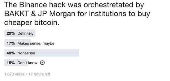 加密货币分析师Alex Krüger在推特上发起一个投票:认为币安黑客攻击是摩根大通和BAKKT想要抄底策划的一起事件。投票结果显示,48%的网友表示这是无稽之谈,仍有20%的网友表示同意。