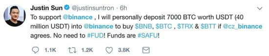 有意思的是,波场创始人孙宇晨最早发布推特支持币安,他表示,将以个人名义存入7000BTC等值美元(4000万美元)进入币安,用于增持币安币BNB,比特币BTC,波场TRX与流币BTT。
