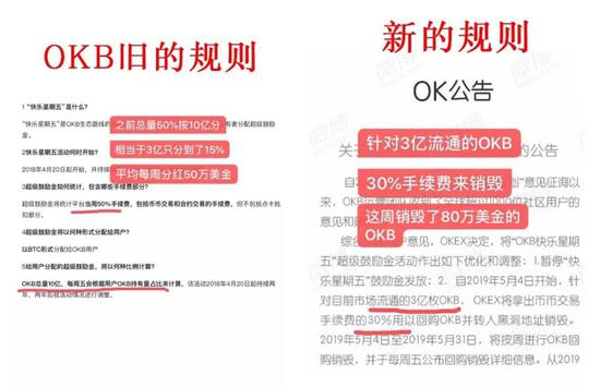 “OKB总量有10亿,市场流通3亿。快乐星期五是按照10亿为基数来分红,相当于3亿OKB持有者最终实际能分到15%(50%*3/10)的手续费奖励;调整后,30%的手续费是以3亿为基数来计算的。”