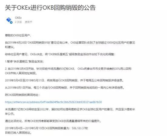 “这次回购销毁,是针对目前市场流通的3亿枚OKB,拿出币币交易手续费的30%来回购。而此前的‘快乐星期五’鼓励金是基于10亿枚OKB的总量来分红,相当于3亿OKB持有者最终实际能分到15%(50%*3/10)的手续费奖励。”