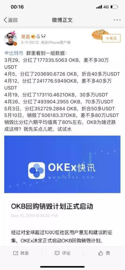 他说,以前,每周五还能获得分红,得到的了实实在在BTC,后来分红改成了OKB,“可现在不仅不分红了,平台拿出的手续费比例也变少了,还不如不回购销毁。”