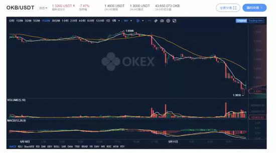 暴跌始于5月10日晚8点30分左右,OKB从1.63美元开始“跳水”,15个小时后,价格在1.3美元,跌幅达20%。