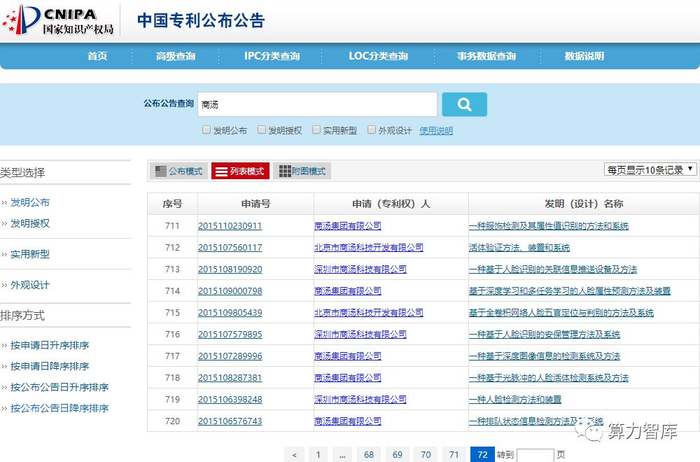 从国家知识产权局专利公布公告平台查询发现,商汤相关的查询结果约有720条(上图),但以相同方式查询虹软,结果仅数十条(下图)。