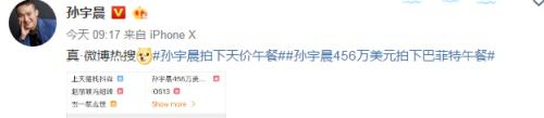 6月4日在正式宣布以破纪录的456.7888万美元(折合人民币约3100万元)成功拍下巴菲特20周年慈善午宴的微博中,孙宇晨加上了“孙宇晨拍下天价午餐”的话题标签,当话题真正上热搜之后,他还喜不自禁地发了一条微博。