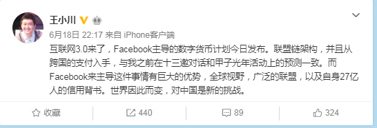 而在6月18日Facebok发币消息传出后,搜狗CEO王小川发布微博表示,称Facebook主导的数字货币计划标志着互联网3.0时代的到来。此外王小川还表示,世界将因Facebook而变,对中国来说也是巨大的挑战。