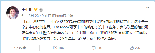 6月18日晚间,王小川还发布了一条微博,称中国的移动支付和人民币国际化业务或受到Facebook的Libra计划的挑战。