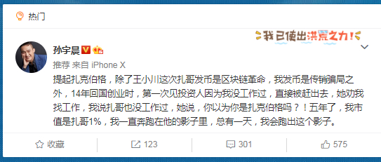 提起扎克伯格,除了王小川这次扎哥发币是区块链革命,我发币是传销骗局之外,14年回国创业时,第一次见投资人因为我没工作过,直接被赶出去,她劝我找工作,我说扎哥也没工作过,她说,你以为你是扎克伯格吗?!五年了,我市值是扎哥1%,我一直奔跑在他的影子里,总有一天,我会跑出这个影子。
