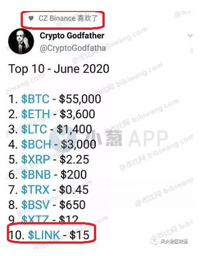 近期,币安CEO赵长鹏还点赞一则认为Chainlink能在2020年6月挺进前十大币种的推文。