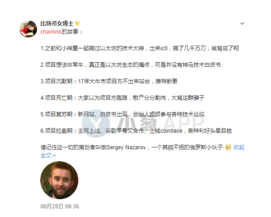 @比特币女博士还对ChainLink的故事进行了一个简单回顾,据其说法,ChainLink创始人Sergeyd Nazarov曾带领该项目历经多段“风骚往事”,“一起和小神童搞过以太坊技术大神”、“ICO赚了几千万美金”、“疑似跑路”等等。