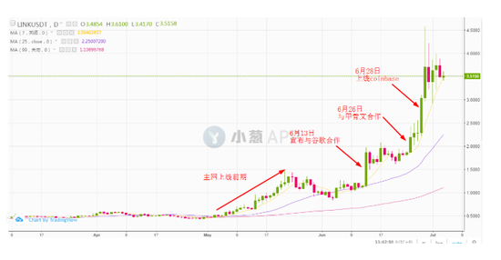 6月28日,Chainlink还上线了Coinbase主站,成为继比特币、以太坊、瑞波币、比特币现金、莱特币、以太坊经典之后,Coinbase上的第7大币种。Coinbase上线就大涨的上币效应在Chainlink身上再一次灵验,其币价短时间内大涨10个点以上。