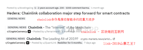 突出的币价表现以及互联网巨头的加持让Chainlink瞬间成为圈内“新晋网红”,国外Reddit、Twitter甚至国内微博上关于该项目的讨论也层出不穷。