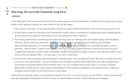 7月1日,还有一名技术开发人员u/colorsdontlie在Reddit上警告“不要长期持有Chainlink”。他查阅项目白皮书及相关消息发现,该项目涉嫌虚假宣传,并且Chainlink在技术上也并成熟。其观点如下: