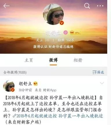 而前一天,针对财新报道孙宇晨被边控一事,孙宇晨还在微博表示,财新的报道完全不实,并在旧金山进行了直播试图证实自己没有被边控。随后,财新披露了更多孙宇晨被边控的细节,胡舒立在个人微博进行了转发。