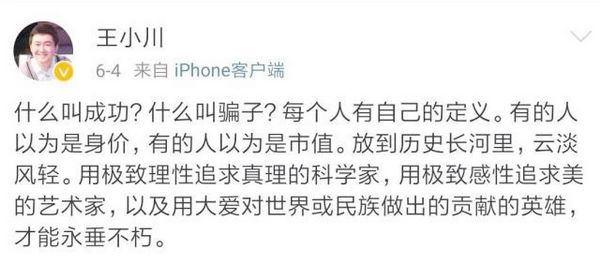 孙宇晨在拍得巴菲特午餐后曾在自己朋友圈中表示:“2014年11月24日我和王小川录制节目,我永远也忘不了他这打量骗子的眼神。他说我是骗子,肯定会失败,和我录节目是耻辱,最后甚至没法录下去。后来不到三年我公司就超过了搜狗市值,人生中瞧不起你的对你的鞭策更加刻骨铭心。”