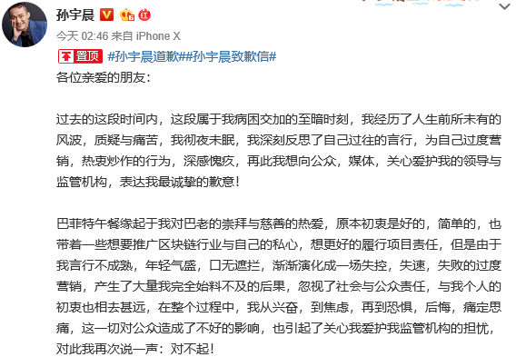 孙宇晨发道歉信!财新、监管部门、王小川 我错了