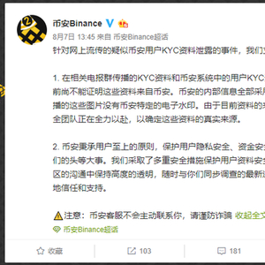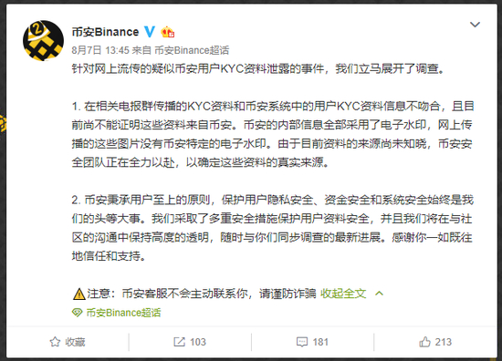 8月7日,币安通过微博表示,收到收到一名身份不明人士的威胁,被要求以300个比特币的筹码换取他声称掌握的关于Binance的1万个KYC信息。因没有马上拿到勒索款,该身份不明人士通过网络泄露所掌握信息。
