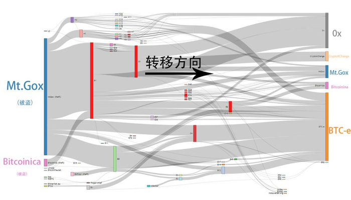 分析显示,大部分被盗的比特币(约41万枚)都流向了一个名为BTC-e的交易所。而且在转移比特币时有一个昵称为“WME”的用户(图中红色竖条)多次出现并充当中间商的角色。