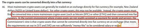 仔细看看新西兰税务局的公告,它明确指出现在的环境下,大家还没有准备好把加密货币作为日常购买物品和服务的支付手段,它不能像钱一样被视作工资或薪酬,员工收到的加密货币形式的工资也必须先转换成比特币和以太币等主流货币,然后再转换成法定货币。