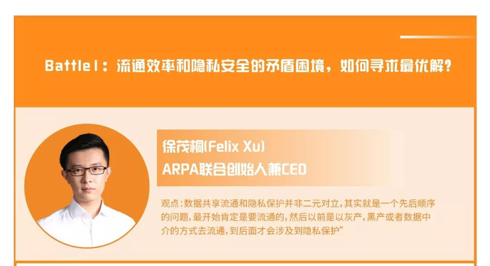 ARPA联合创始人兼CEO Felix Xu从数据市场的本质发展逻辑来阐述,他认为数据共享流通和隐私保护并非二元对立,不可调和,其实就是一个先后顺序的问题,最开始肯定是要流通的,然后以前是以灰产,黑产或者数据中介的方式去流通,到后面才会涉及到隐私保护,随着后续数据价值的不断提高,隐私问题也必然会被重视起来,这是事物发展的自然规律,数据领域也不外如是,流通效率和隐私安全就像天秤的两端,在高低失衡间,最终会随着市场的成熟,技术的不断优化,数据意识的强化普及而走向平衡,ARPA作为一个基于智能合约和多个区块链网络交换信息的安全多方计算网络,便是为隐私安全而生。