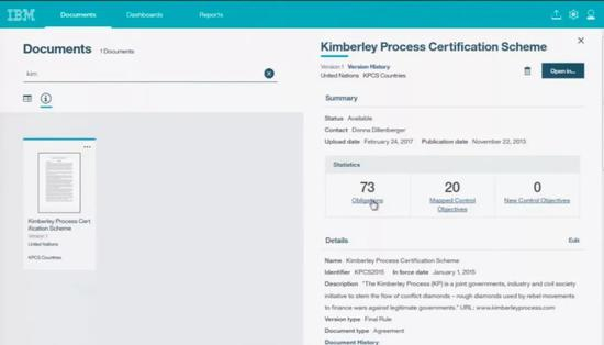 IBM 研究院院士 Donna Dillenberger 在 IBM 云端大会,实时上机演示将金百利机制的法律文件交给 IBM Watson 阅读后,将所有常人或许难以理解的法律条文与规则,透过语意辨识自动分析、归纳出执行准则后,以此自动写出用以查证区块链上钻石事务数据的程序逻辑判别式,并以此判别式直接筛选出有问题的钻石交易纪录。