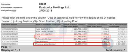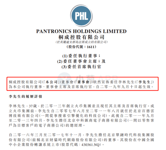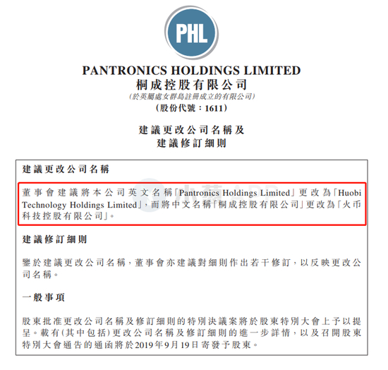 9月10日,港股上市公司桐成控股发布公告称,董事会建议将本公司英文名称‘Pantronics Holdings Limited’更改为‘Huobi Technology Holdings Limited’,而将中文名称‘桐成控股有限公司’更改为‘火币科技控股有限公司’,并委任李林为公司执行董事、董事会主席及首席执行官,即日生效。