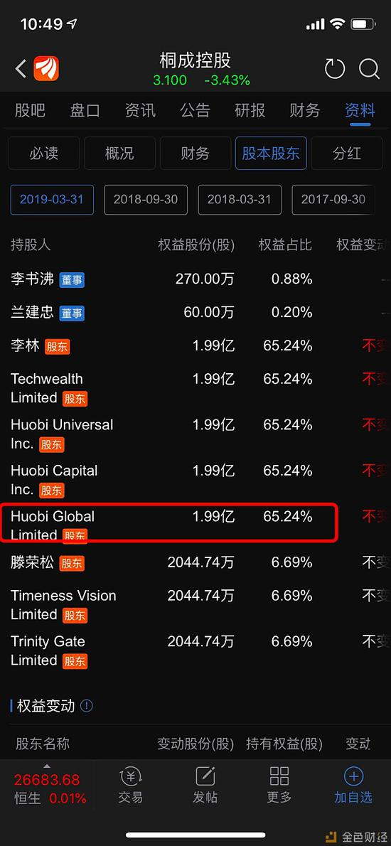 桐成控股有限公司其实是火币全球旗下的控股子公司,据东方财富显示,火币全球拥有桐成控股的65.24%股份,为最大控股股东。