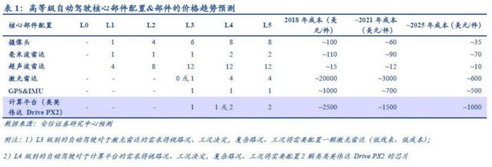 因此,从这个阶段的实操层面来讲,摄像头为主导是主流,但是未来随着激光雷达成本的降低,预计 2025 年达到L4 阶段时,激光雷达将获得发展契机。犹如,特斯拉代表现在,Waymo代表未来。