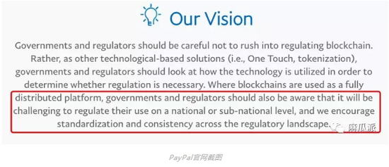 这一点从PayPal官网中的愿景就能看出来,它呼吁监管机构赶紧出台“标准和一致性”的相关政策来规范行业。