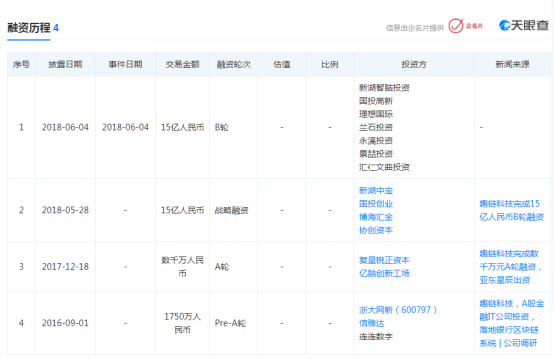 2018年5月,新湖中宝(600208)通过全资子公司浙江新湖智脑投资管理合伙企业与杭州趣链科技有限公司签署投资合作协议。智脑投资拟以1.09亿元受让趣链科技五位股东持有的190.9464万元出资额;此外,智脑投资还拟以11.21亿元认缴趣链科技新增注册资本1959.29万元。增资完成后,智脑投资占趣链科技注册资本的比例为49%。新湖中宝副总裁兼董事会秘书虞迪锋同时担任趣链科技董事。