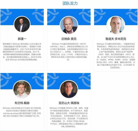 RXChain 声称平台顾问为美国罗斯资本(ROTH CAPITAL)合伙人的庄纳森·莫克;RXChain 平台顾问资深经理人为,专精商务项目策划和执行、纳斯达克上市公司运营及财务管理,且擅长中英语商务谈判和演讲、美国海外以及本土资产规划和管理的鲁道夫·多米尼克;RXChain CMO 为在国际支付方面有 20 年的经验, 包括支付咨询公司联盟支付解决方案的 md的布兰特.戴赫;RXChain CTO为在世界顶级 IT 公司,亚历山大担任过包括 CTO、项目经理、IT主管等在内的高层要职,并一手创办了利用 VR/AR、FinTech、绿色能源技术和人工智能提供 UBI/ UBL 的雨神项目的亚历山大·佩提埃。