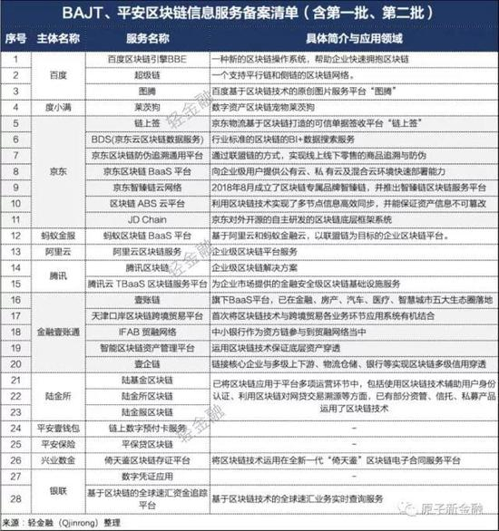 据轻金融梳理统计,在国家网信办发布的两批区块链信息服务备案名单中,BATJ、平安集团(包括旗下金融科技公司金融壹账通、陆金所等)、兴业数金、银联,合计有28个区块链信息产品服务备案,集中于底层平台、企业解决方案、供应链金融、商品溯源等。