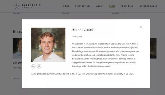 而被称为布兰特.戴赫的亚历山大·拉森,则为Blockchain Capital这家区块链风投企业的合伙人。根据介绍,亚历山大·拉森以优异成绩毕业于圣路易斯华盛顿大学系统工程学士学位,在加入Blockchain Capital之前他曾在Guggenheim Partners(古根海姆合伙公司)担任投资银行分析师,专注于生物技术领域的并购和股权融资。