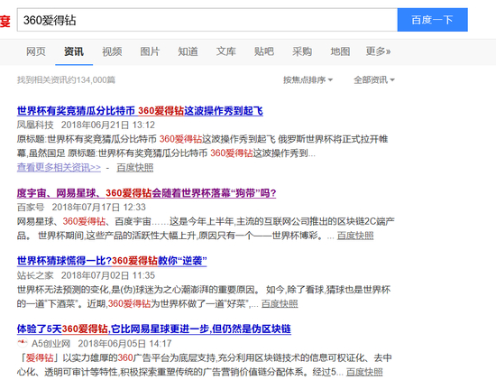 同样靠世界杯带热度的还有360爱得钻。360爱得钻2018年5月31日发布,在百度搜索引擎中检索其资讯,除上线的消息外,几乎全是与世界杯博彩的相关的消息,之后便无动态。
