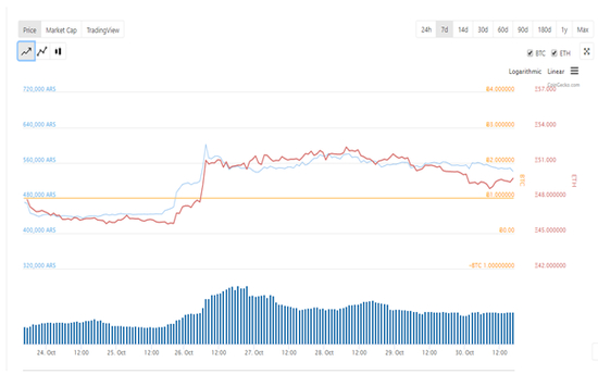 比索与以太坊及比特币之间的关系与美元十分接近。如果美元在阿根廷受到控制,则比索的使用率就会上升,这将会对阿根廷的经济产生积极的影响。