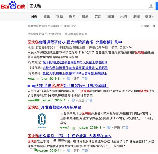“资金盘早就开始做百度推广了,只是它们以前不会买‘区块链’这个关键词,韭菜也很少会搜。”王川说,“现在不一样了,区块链火了,它们也就盯上了这个词。”