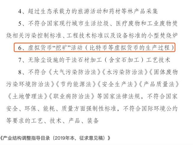 2019年4月8日,在《产业结构调整指导目录(2019年本,征求意见稿)》,虚拟货币“挖矿”活动被列入淘汰类产业,属于“落后生产工艺装备”类目。该指导目录还显示,未标淘汰期限或淘汰计划的条目为国家产业政策已明令淘汰或立即淘汰。而虚拟货币“挖矿”活动这一条没有标上“淘汰期限或淘汰计划”