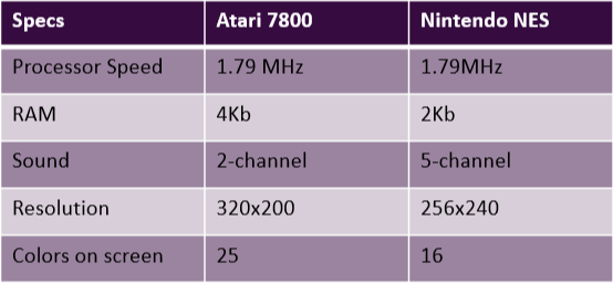 Nintendo Entertainment System(NES,俗称红白机)和Atari 2600是游戏机的开山鼻祖。由于Atari 2600比NES早几年,因此我们选择研究两家公司的同时代产品:Atari 7800和NES,二者均于1986年在北美发布。