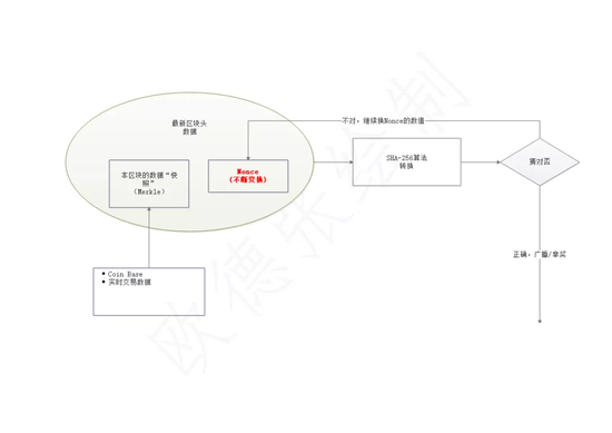 然后每个矿工节点基于区块NB的预备数据,开始全力挑战此时段的工作证明(即数字猜谜,此处简化业务逻辑见下图);