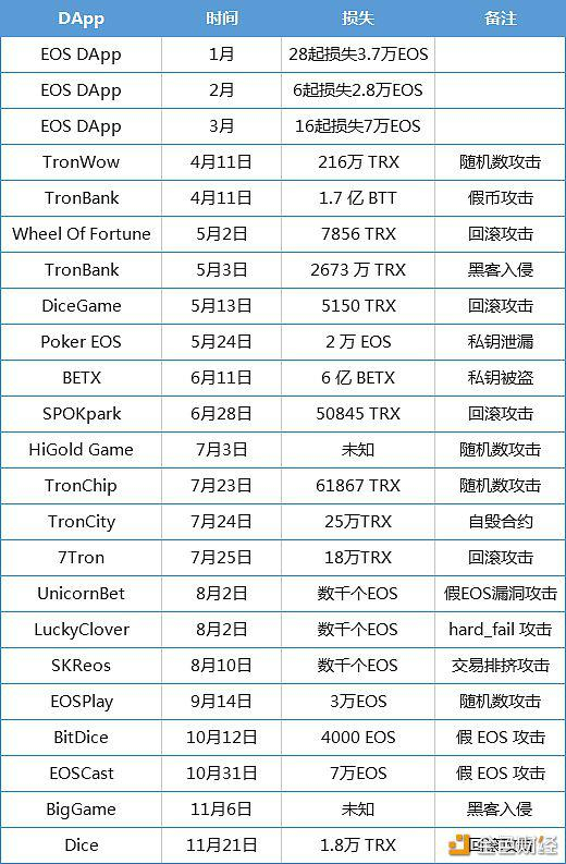 虽然DApp生态建设今年处于飞速发展阶段,但是相关安全问题不容忽视,截止目前DApp被黑总损失将近1.3亿美元,大多被黑事件发生于EOS DApp,集中爆发于今年2月,攻击手法大多为:交易排挤攻击、随机数攻击、回滚攻击、假EOS漏洞攻击。