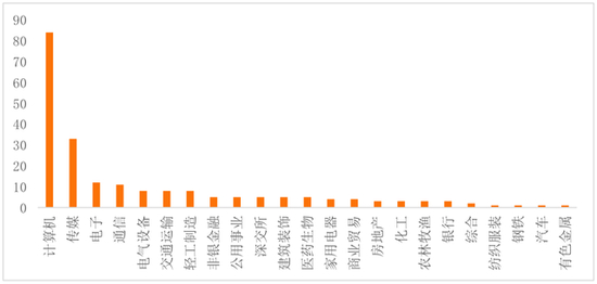 从行业分布来看,概念股所属行业主要集中计算机(84只)、传媒(33只)、电子(12只)、通信领域(11只)等。