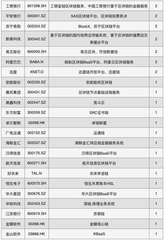 其中,A股上市企业31家,包括深交所21家,上交所10家。另外,在香港上市5家,分别为众安在线(06060.HK)、腾讯控股(00700.HK)、卓尔智联(02098.HK)、金蝶软件(00268.HK)、金山软件(03888.HK);美国上市的区块链中概股6家,包括,百度(BIDU.O)、京东(JD.O)、爱奇艺(IQ.O)、阿里巴巴(BABA.N)、迅雷(XNET.O)、好未来(TAL.N)。