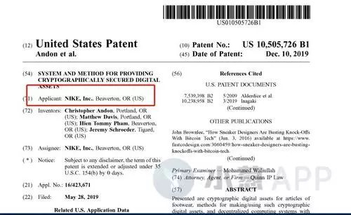 这个专利是个什么东东呢?据了解,该专利概述了一个系统,用户可以通过该系统通过以太坊区块链将加密的数字资产附加到物理产品上。在这种情况下,物理产品是耐克运动鞋。最大的作用是耐克可以利用区块链技术追踪运动鞋所有权,并验证其真实性。