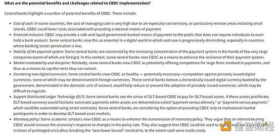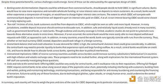 此外,在国际货币基金组织(IMF)文章《中央银行数字货币:4个问题和解答》中还讨论央行数字货币好处及挑战。IMF称央行数字货币在降低现金成本、增强金融包容性、支付系统的稳定性、市场竞争性和原则性、与私人发行的数字货币竞争、支持分布式账本技术(DLT)、货币政策等方面有好处,但仍面临商业银行重要性可能被弱化、运行风险、 中央银行的资产负债表和信贷分配、国际影响、中央银行的成本和风险等各种挑战。总之,每个国家都必须根据其特殊情况权衡CBDC的利弊。