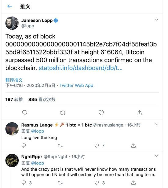 Statoshi联合创始人兼比特币网红开发者Jameson Lopp在Twitter上庆祝了这一里程碑,其写道:“今天,截至第616064个区块(00000000000000000001145bf2e7cb7f04df55feaf3b55d9f6511522bbbf333f),比特币区块链上确认的交易超过了5亿笔。)”