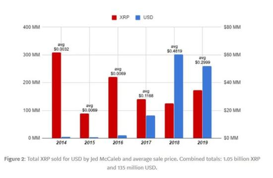 Whale Alert通过多方位追踪后还发现,Jed McCaleb的钱包地址最高持有80亿XRP。在2014年至2019年期间,Whale Alert总共对其转账追踪到10.5亿XRP,每个XRP平均销售0.129美分,总销售额为1.35亿美元,按照目前出售速度估计,Jed McCaleb出售完全部XRP需花20年时间。