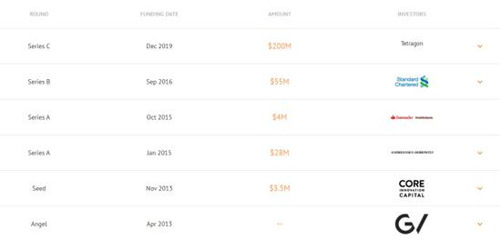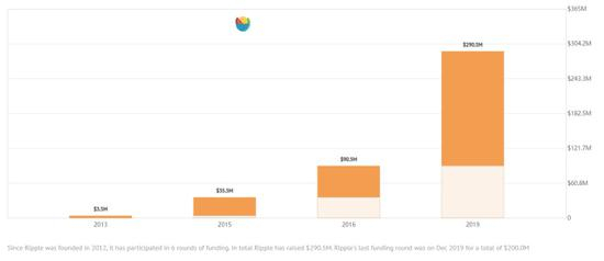 2016年9月,Ripple获得Standard Chartered 5500万美元B轮投资。2019年12月,再次获得由Tetragon领投,SBI Holdings和Route 66 Ventures参投共计2亿美元C轮融资。