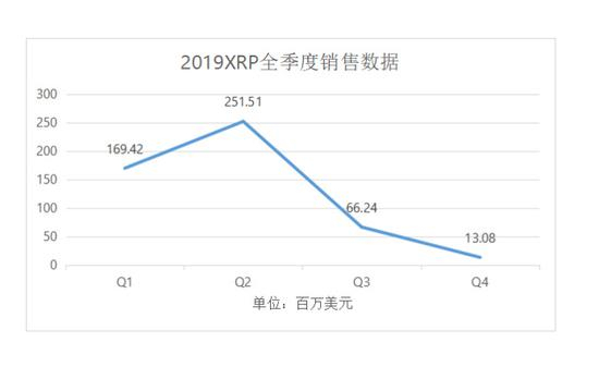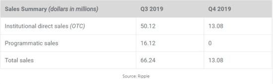 据Ripple官方2019年第四季度XRP市场报告显示,通过场外,2019年全年Ripple总共出售5亿美元XRP,第一季度1.69亿美元,第三季度0.5012亿美元,第四季度0.1308亿美元。