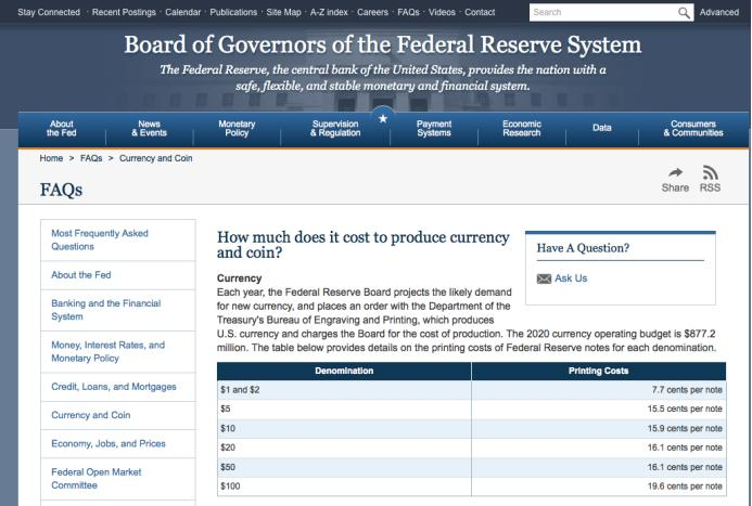 该网站详细说明了每种面值的美联储票据的印刷成本。(图片来源:美联储官方网站, https://www.federalreserve.gov/faqs/currency_12771.htm)