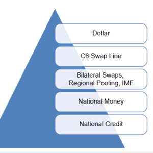 Perry Mehrling描述的美元主导的层次化国际货币体系如下图所示:位于最顶层的是全球主导货币美元,其次是美英加瑞(士)日欧央行之间的常设、并且无额度限制的C6货币互换协议、再其次是其它双边货币互换协议和区域性流动性池(如清迈协议、欧洲货币联盟或IMF信贷额度)、接下来分别是国内货币和国内信贷。任何国家央行可以通过与C6任何成员的双边互换协议,或通过其他区域性流动性池,获得美元流动性支持,否则他们只能通过囤积美元的方式来创造美元流动性。中国和美国间没有货币互换协议,中国通过与英日的双边货币互换协议能够访问到美元全球流动性支持。因此在美元主导的国际货币层次中,人民币位于C6货币互换协议之下。