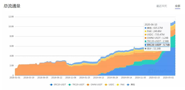 与此同时,基于以太坊的稳定币也占据了大部分市场份额。包括USDT、USDC、PAX、BUSD、TUSD、HUSD、DAI等稳定币均基于ERC-20协议生成,据etherscan以太坊浏览器数据显示,这些稳定币流通总市值超过100亿美元。丰富的稳定币体系,满足了用户资产抵押、点对点借贷等基本金融需求,使无准入制的开放式金融初步形成。